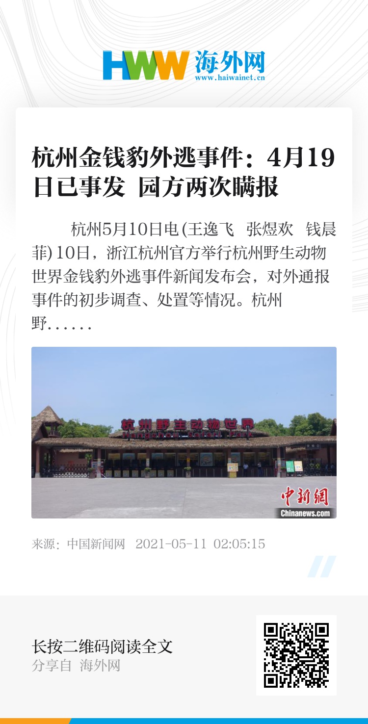 中新网杭州5月10日电(王逸飞 张煜欢 钱晨菲)10日,浙江杭州官方举行杭州野生动物世界金钱豹外逃事件新闻发布会,对外通报事件的初步调查、处置等情况。