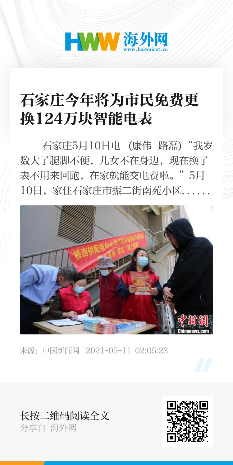 中新网石家庄5月10日电 (康伟 路磊)“我岁数大了腿脚不便,儿女不在身边,现在换了表不用来回跑,在家就能交电费啦。”5月10日,家住石家庄市振二街南苑小区的卢大妈看着自家刚刚更换的智能电表,喜悦之情溢于言表。