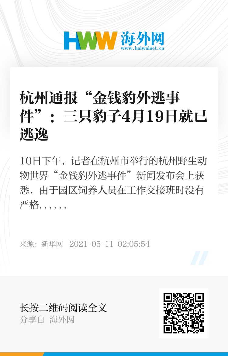 在发布会现场,杭州市副市长王宏说,5月6日到7日,当地接到群众报警称发现疑似金钱豹的踪迹,主管部门多次询问杭州动物园和杭州野生动物世界负责人,两家均表示无逃逸发生。
