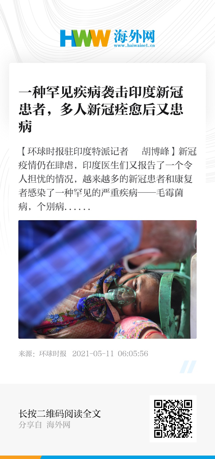 【环球时报驻印度特派记者 胡博峰】新冠疫情仍在肆虐,印度医生们又报告了一个令人担忧的情况,越来越多的新冠患者和康复者感染了一种罕见的严重疾病——毛霉菌病,个别病患甚至被迫摘除眼球以防止真菌侵入脑部危及性命。印度资深耳鼻喉科医生帕特尔说:“一场可杀死新冠肺炎康复者的毛霉菌病‘海啸’正在发生。”