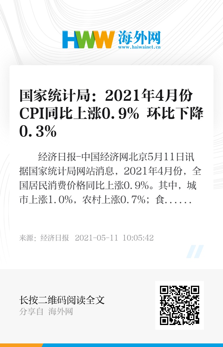 经济日报-中国经济网北京5月11日讯 据国家统计局网站消息,2021年4月份,全国居民消费价格同比上涨0.9%。其中,城市上涨1.0%,农村上涨0.7%;食品价格下降0.7%,非食品价格上涨1.3%;消费品价格上涨1.0%,服务价格上涨0.7%。1―4月平均,全国居民消费价格比去年同期上涨0.2%。