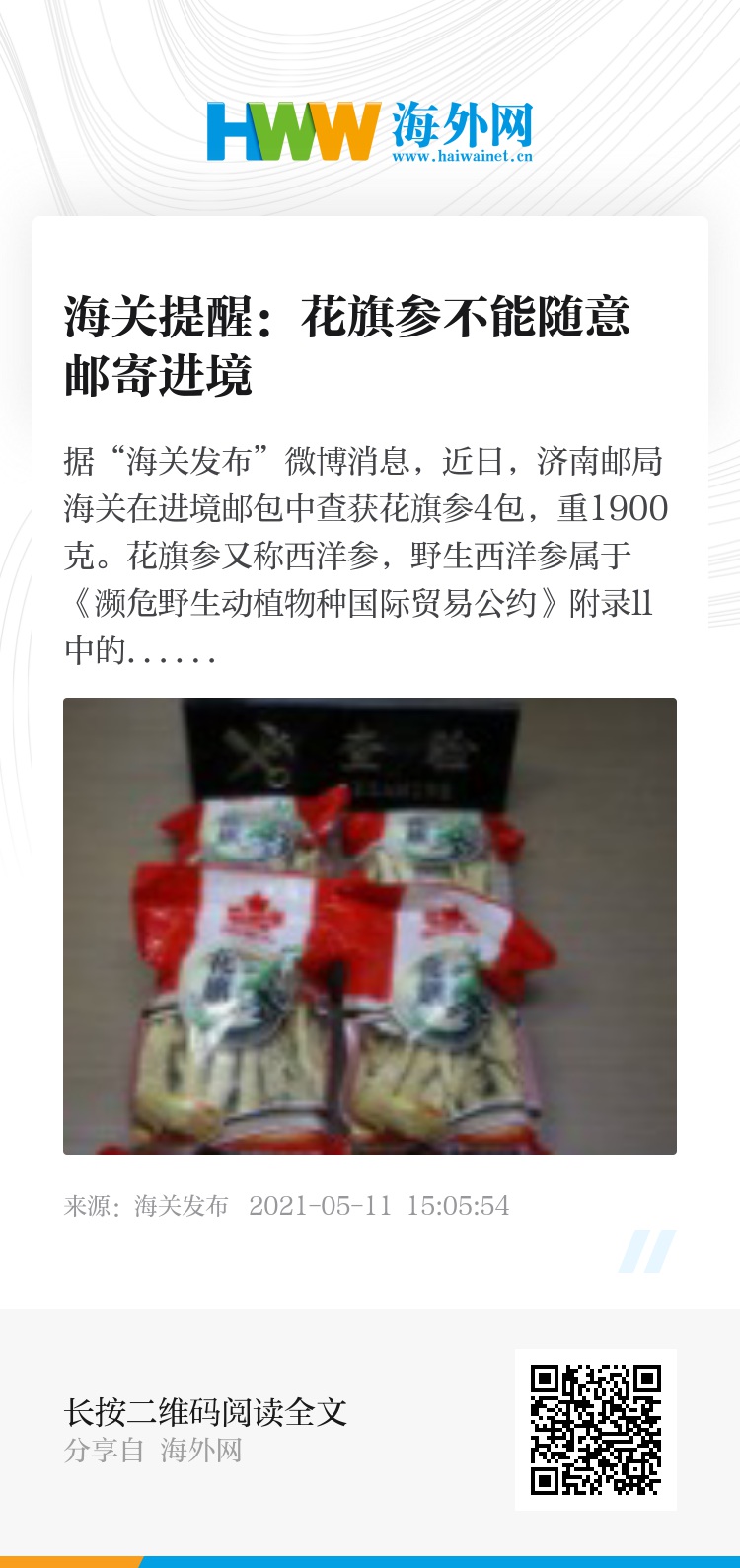 据“海关发布”微博消息,近日,济南邮局海关在进境邮包中查获花旗参4包,重1900克。花旗参又称西洋参,野生西洋参属于《濒危野生动植物种国际贸易公约》附录ll中的植物,属濒危物种。除持有濒危物种允许进口证明外,严禁携带、邮寄入境。