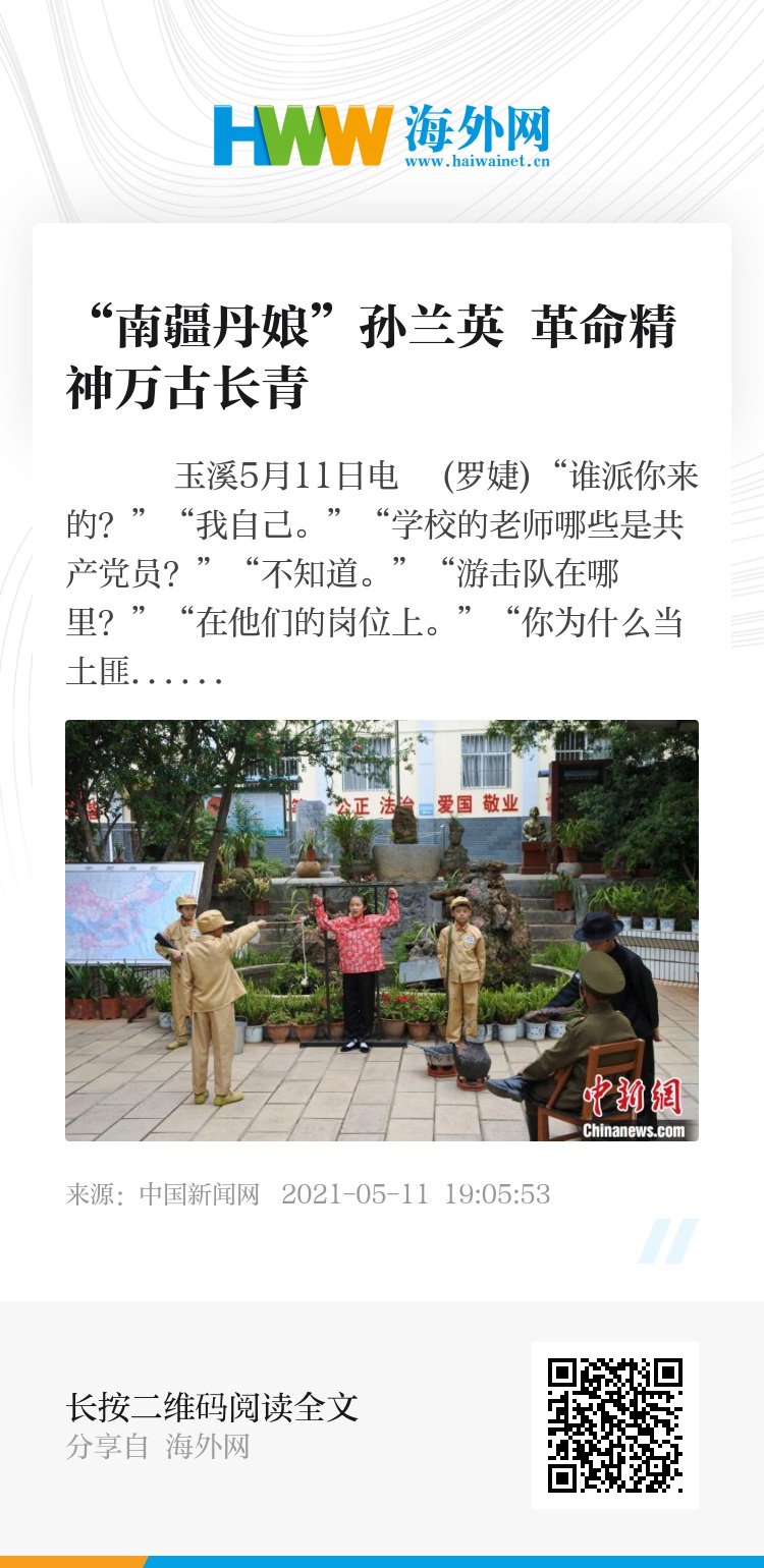 中新网玉溪5月11日电 (罗婕)“谁派你来的?”“我自己。”“学校的老师哪些是共产党员?”“不知道。”“游击队在哪里?”“在他们的岗位上。”“你为什么当土匪?”“我没有抢老百姓,没有杀老百姓,我不是土匪!”这段革命烈士孙兰英被严刑拷打的审讯对话在课本剧《南疆丹娘孙兰英》中重演。