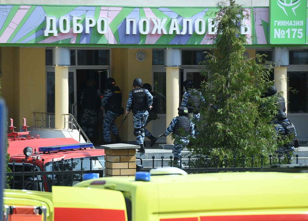 当地时间2021年5月11日,俄罗斯喀山,一所中学发生枪击案。防暴警察在事故现场。图片来源:人民视觉