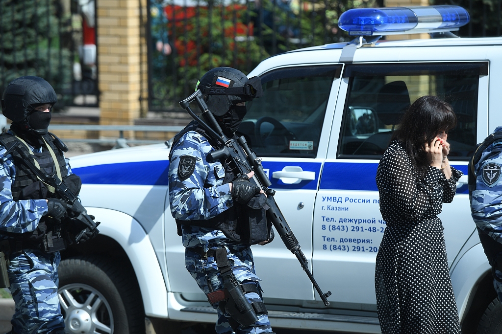 当地时间2021年5月11日,俄罗斯喀山,一所中学发生枪击案。防暴警察在事故现场。图片来源:人民视觉