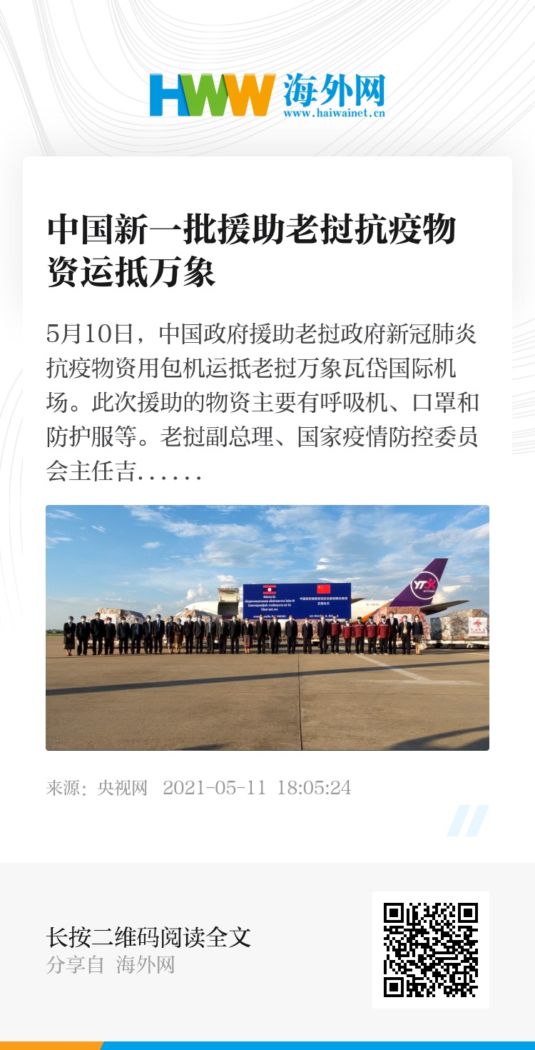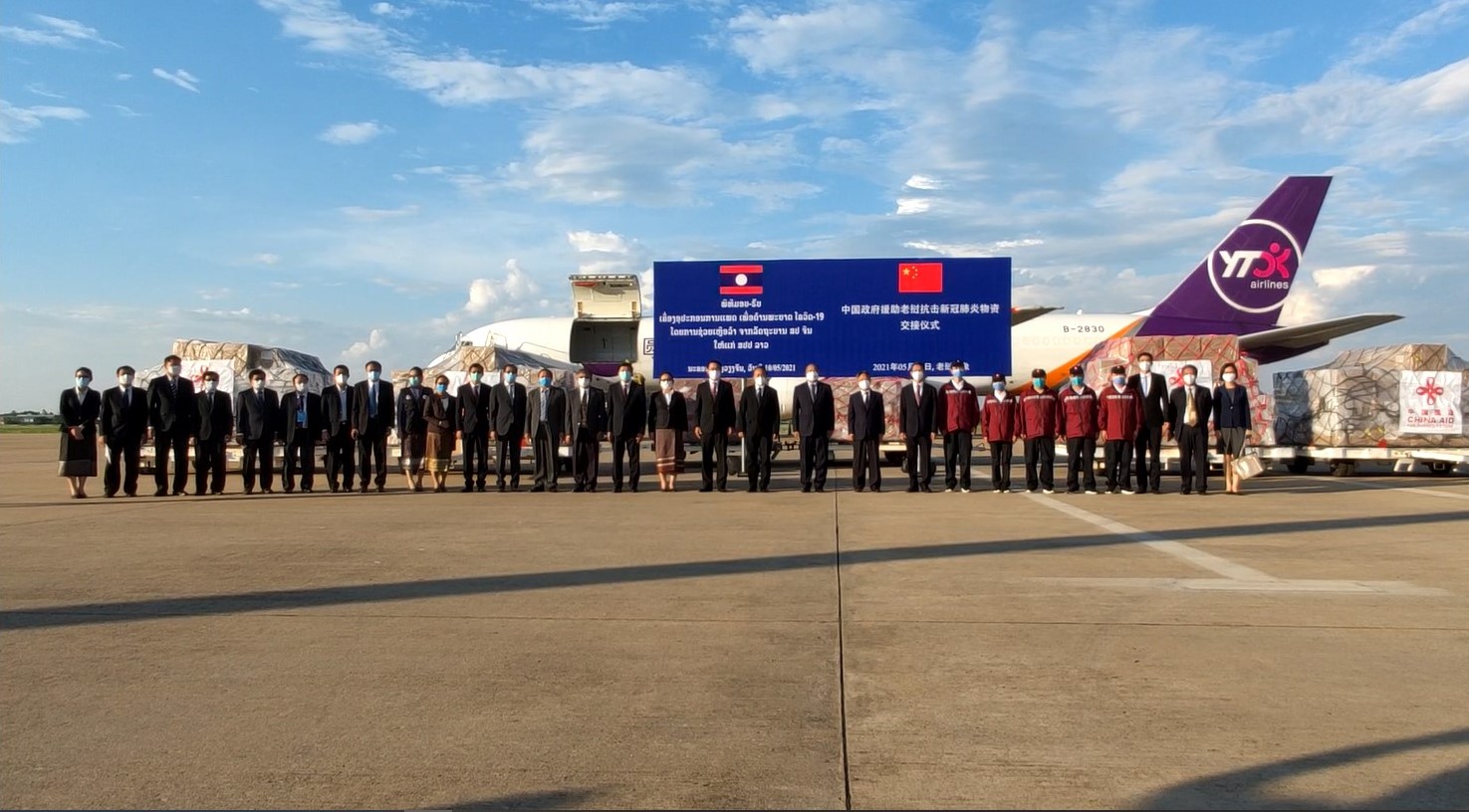 5月10日,中国政府援助老挝政府新冠肺炎抗疫物资用包机运抵老挝万象瓦岱国际机场。此次援助的物资主要有呼吸机、口罩和防护服等。老挝副总理、国家疫情防控委员会主任吉乔·凯坎皮吞、中国驻老挝大使姜再冬到机场迎接。吉乔·凯坎皮吞向姜再东大使转交了老挝国家总理潘坎给中国政府的感谢信。