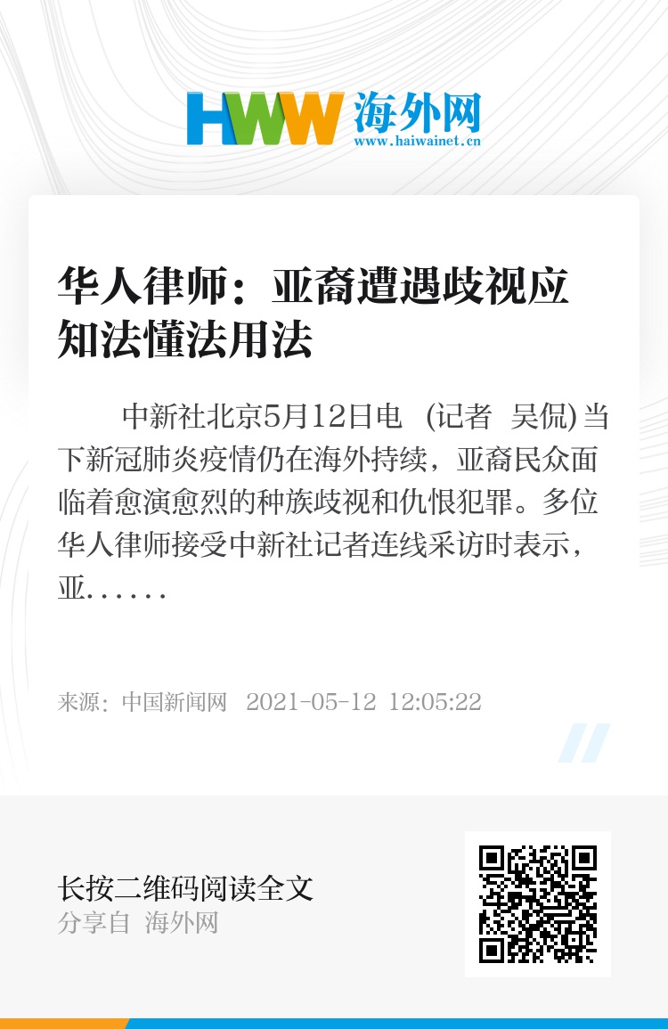 中新社北京5月12日电 (记者 吴侃)当下新冠肺炎疫情仍在海外持续,亚裔民众面临着愈演愈烈的种族歧视和仇恨犯罪。多位华人律师接受中新社记者连线采访时表示,亚裔应当做到知法懂法用法,严惩暴力行为,勇敢捍卫自己的权益。