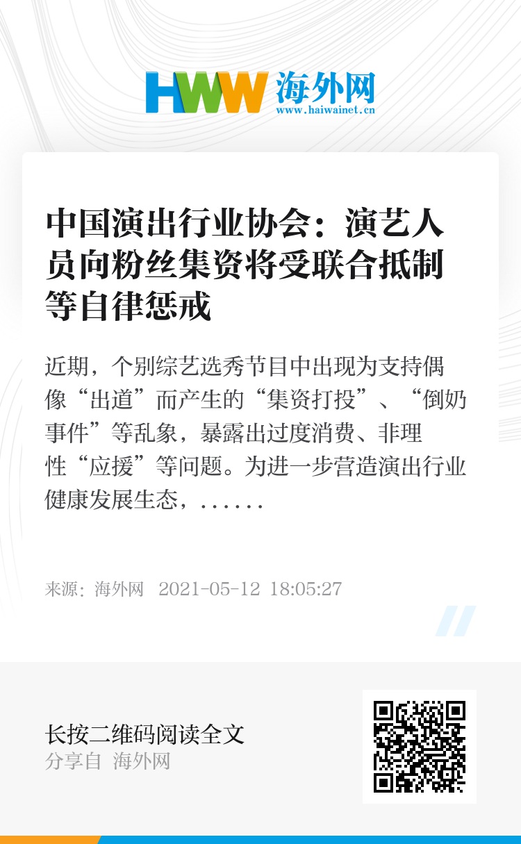 近期,个别综艺选秀节目中出现为支持偶像“出道”而产生的“集资打投”、“倒奶事件”等乱象,暴露出过度消费、非理性“应援”等问题。为进一步营造演出行业健康发展生态,发挥演艺工作者对粉丝的正向引导作用,在相关主管部门指导下,根据《演出行业演艺人员从业自律管理办法(试行)》的规定,中国演出行业协会公告如下:
