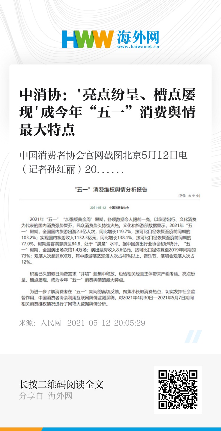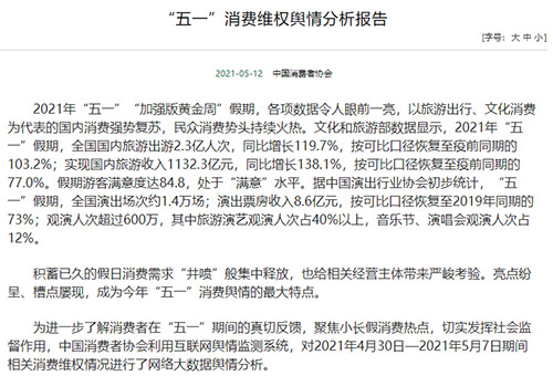 12日,中国消费者协会发布“五一”消费维权舆情分析报告显示,积蓄已久的假日消费需求“井喷”般集中释放,给相关经营主体带来严峻考验。亮点纷呈、槽点屡现,成为今年“五一”消费舆情的最大特点。