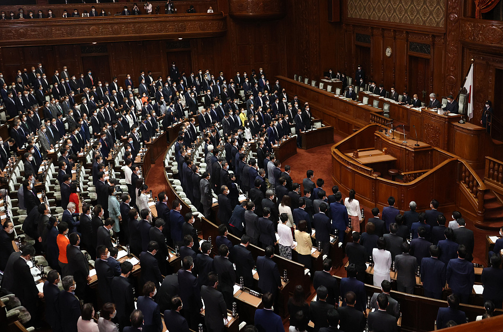 图为当地时间5月11日,日本首相菅义伟和其他议员在国民议会下院全体会议上批准一项宪法修正案。图片来源:人民视觉