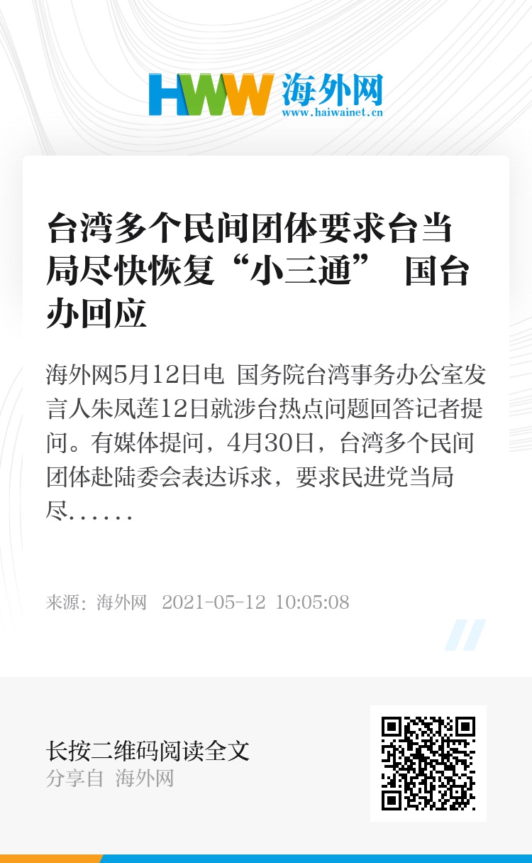 有媒体提问,4月30日,台湾多个民间团体赴陆委会表达诉求,要求民进党当局尽快恢复两岸“小三通”,方便两岸民众往来。请问发言人如何看待台湾社会的这些声音?