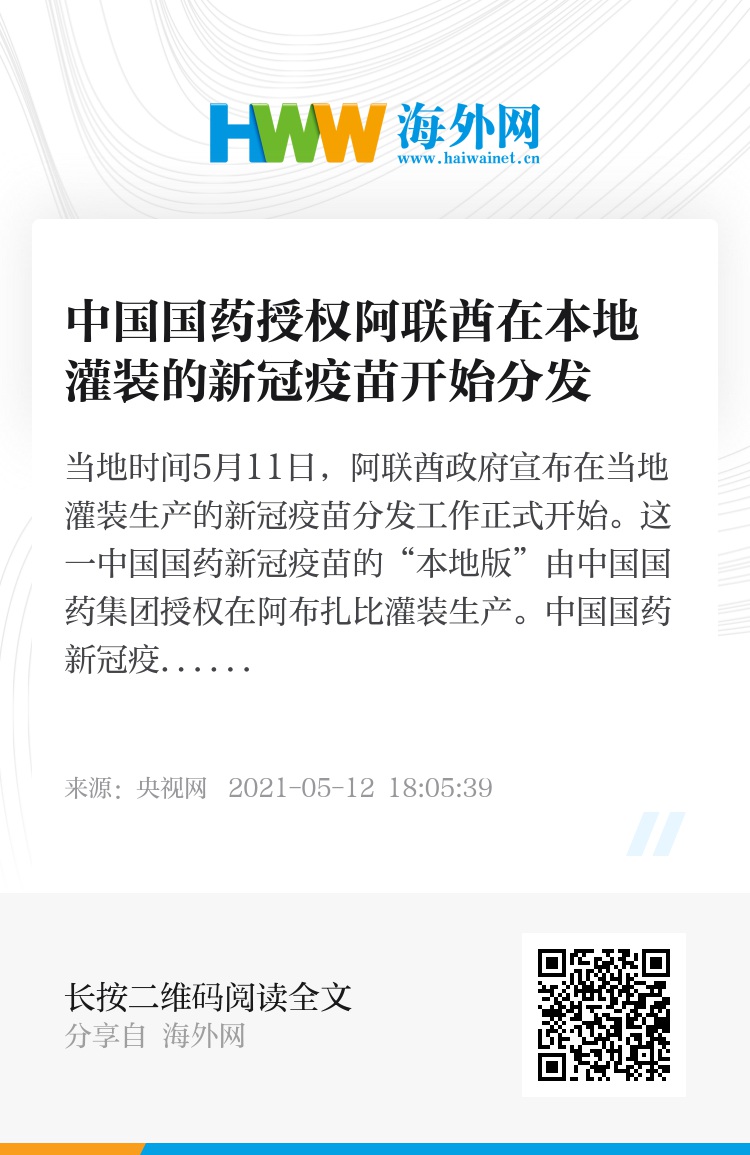 当地时间5月11日,阿联酋政府宣布在当地灌装生产的新冠疫苗分发工作正式开始。这一中国国药新冠疫苗的“本地版”由中国国药集团授权在阿布扎比灌装生产。