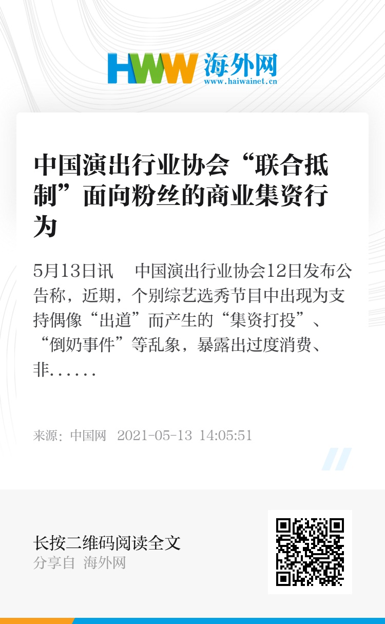 中国网5月13日讯 中国演出行业协会12日发布公告称,近期,个别综艺选秀节目中出现为支持偶像“出道”而产生的“集资打投”、“倒奶事件”等乱象,暴露出过度消费、非理性“应援”等问题。