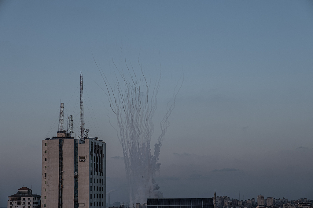 当地时间5月12日,加沙地区,巴勒斯坦向以色列方向发射百枚火箭弹,造成多名以色列人死亡超过100多人受伤。以色列国防军表示,加沙地带发射的火箭弹有几枚直接击中了以色列的建筑物和汽车。图片来源:人民视觉
