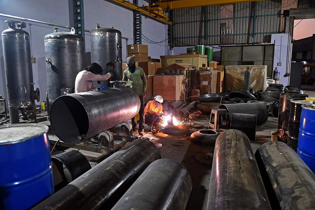 当地时间2021年5月12日,印度艾哈迈达巴德郊区的一家医用制氧厂紧张忙碌。图片来源:人民视觉