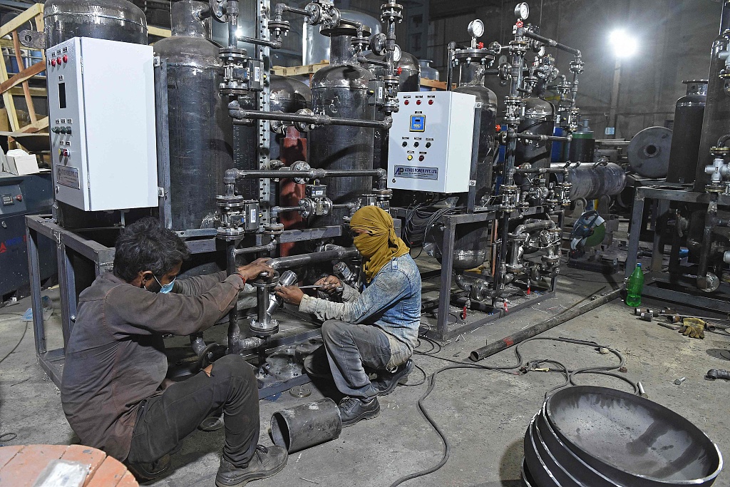 当地时间2021年5月12日,印度艾哈迈达巴德郊区的一家医用制氧厂紧张忙碌。图片来源:人民视觉