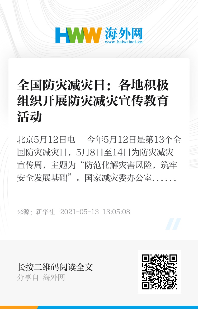 新华社北京5月12日电 今年5月12日是第13个全国防灾减灾日,5月8日至14日为防灾减灾宣传周,主题为“防范化解灾害风险,筑牢安全发展基础”。国家减灾委办公室、应急管理部此前印发通知,对开展全国防灾减灾日活动进行部署。