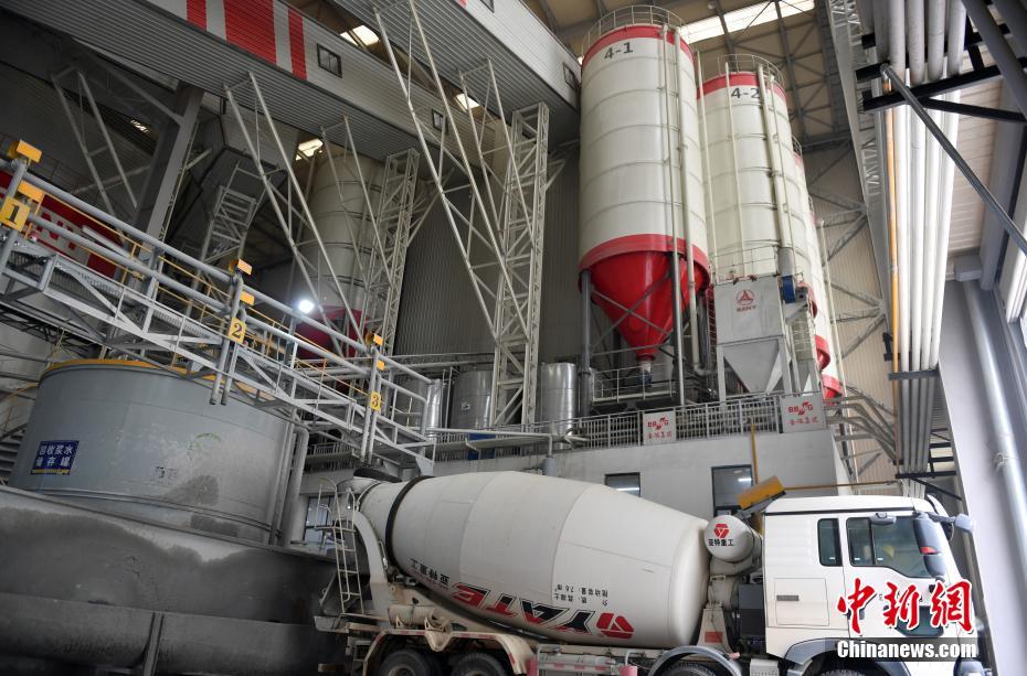 5月13日,一辆辆混凝土罐车、自卸车排队整齐地进入雄安新区容西混凝土搅拌站。据了解,该搅拌站位于雄安新区容城县西北侧,总建筑面积5.1万平方米,共有1座混凝土搅拌站、1座水稳料站以及1座沥青搅拌站,产能可承载新区25%以上建设需求量。图为雄安新区容西混凝土搅拌站现场混凝土罐车正在作业。中新社记者 韩冰 摄