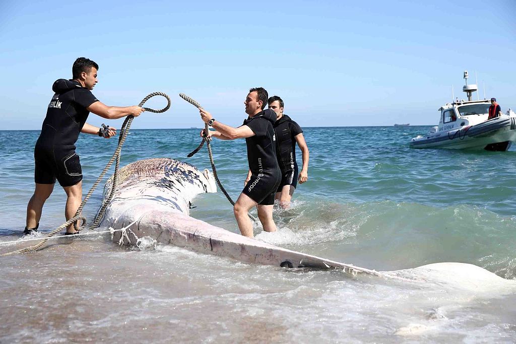 当地时间2021年5月13日,土耳其梅尔辛,14米长鲸鱼搁浅被冲上岸,海岸警卫队和消防员将其转移。图片来源:Anadolu Agency/视觉中国