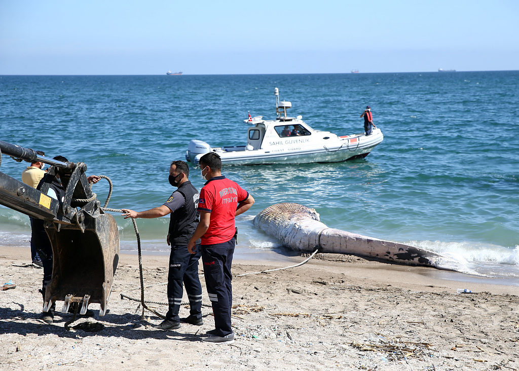 当地时间2021年5月13日,土耳其梅尔辛,14米长鲸鱼搁浅被冲上岸,海岸警卫队和消防员将其转移。图片来源:Anadolu Agency/视觉中国