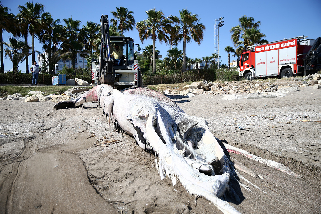 当地时间2021年5月13日,土耳其梅尔辛,14米长鲸鱼搁浅被冲上岸,海岸警卫队和消防员将其转移。图片来源:Anadolu Agency/视觉中国