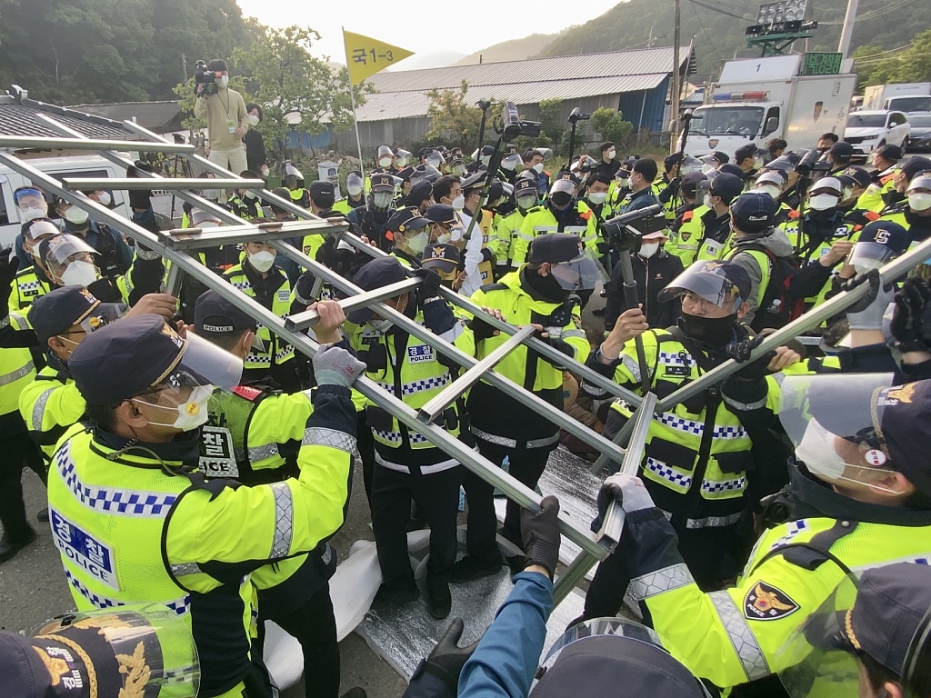 韩“萨德”基地运入物资 警方和反“萨德”部署团体发生对峙
