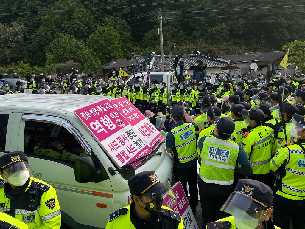韩“萨德”基地运入物资 警方和反“萨德”部署团体发生对峙
