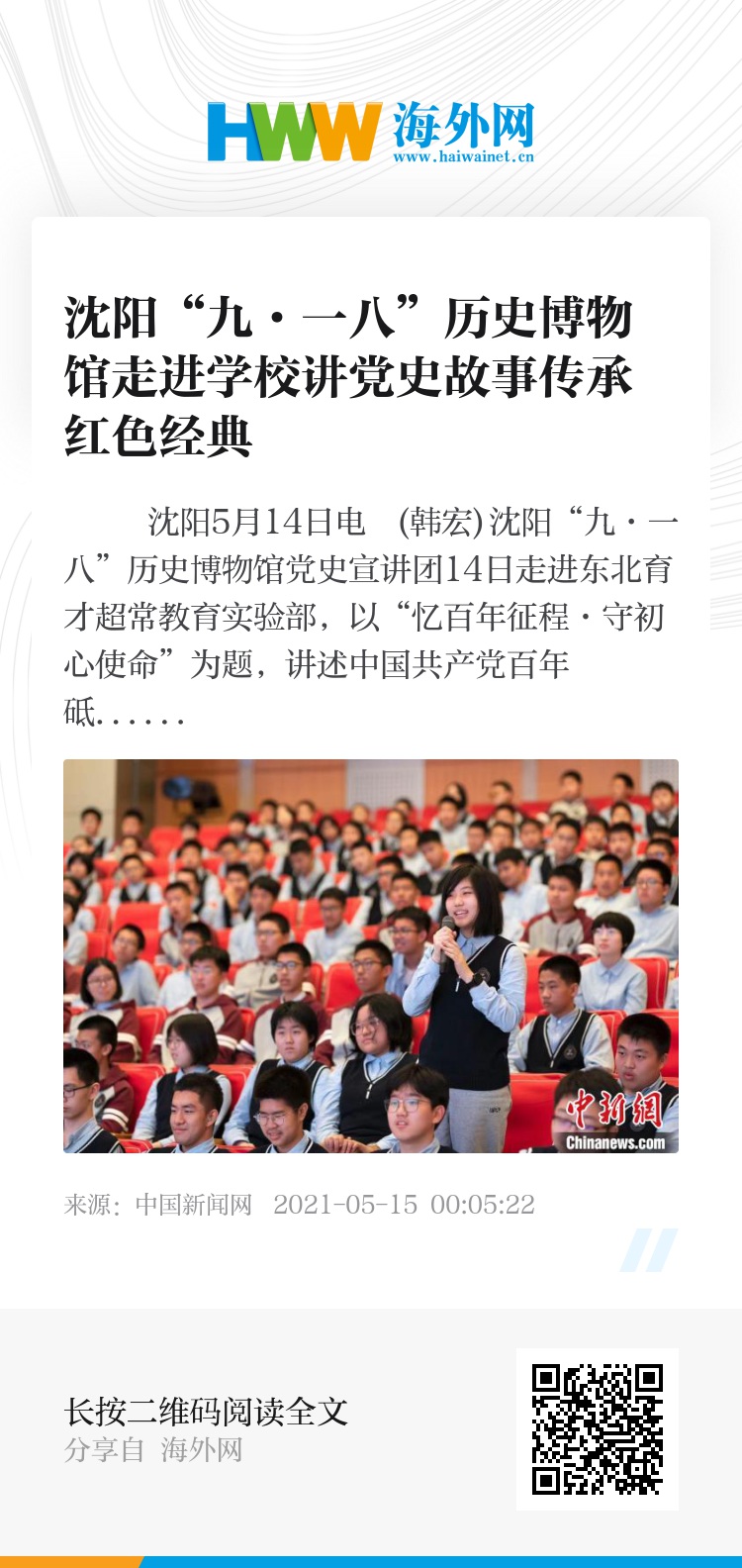 中新网沈阳5月14日电 (韩宏)沈阳“九·一八”历史博物馆党史宣讲团14日走进东北育才超常教育实验部,以“忆百年征程·守初心使命”为题,讲述中国共产党百年砥砺奋进的伟大历程。