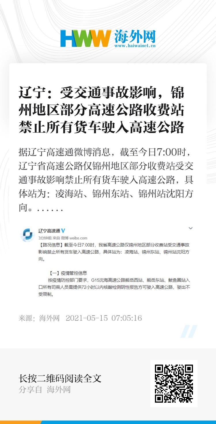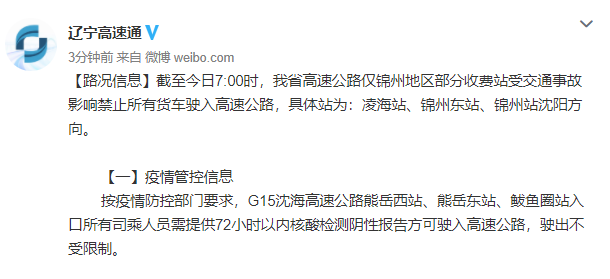 据辽宁高速通微博消息,截至今日7:00时,辽宁省高速公路仅锦州地区部分收费站受交通事故影响禁止所有货车驶入高速公路,具体站为:凌海站、锦州东站、锦州站沈阳方向。