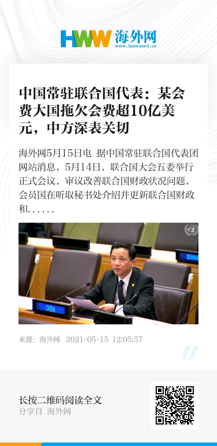 海外网5月15日电 据中国常驻联合国代表团网站消息,5月14日,联合国大会五委举行正式会议,审议改善联合国财政状况问题,会员国在听取秘书处介绍并更新联合国财政和流动性状况基础上阐述立场。中国常驻联合国副代表戴兵大使与会发言。
