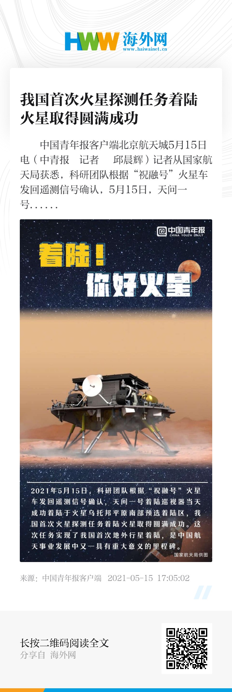 中国青年报客户端北京航天城5月15日电(中青报・中青网记者 邱晨辉)记者从国家航天局获悉,科研团队根据“祝融号”火星车发回遥测信号确认,5月15日,天问一号着陆巡视器成功着陆于火星乌托邦平原南部预选着陆区,我国首次火星探测任务着陆火星取得圆满成功。