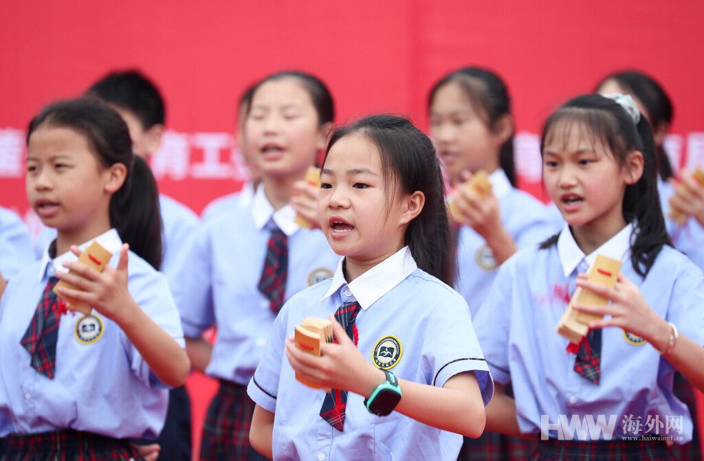 5月14日, 四川省华蓥市以“红心永向党,礼赞新时代”为主题的第十届教育艺术节展演活动在华蓥山广场开幕,来自全市中小学校及幼儿园的1200余名参展学生, 通过现场造纸、蓝染、精书彩绣等特色传统手工艺展示和器乐、歌舞及美术、书法等文艺展演,向市民汇报素质教育所取得的成果,献礼建党100周年。(供图:视觉中国)