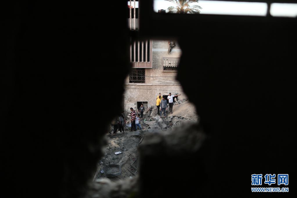 5月14日,巴勒斯坦人在加沙地带城市汗尤尼斯查看被以军空袭摧毁的一处房屋。新华社发(亚西尔摄)