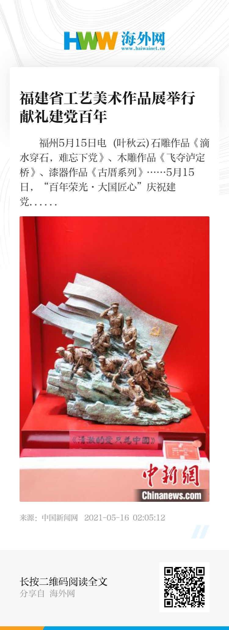 据福建省工艺美术工业有限公司相关负责人介绍,此次展览以“歌颂中国共产党、讲好中国故事”为主题,征集作品总数突破500件,338件(套)作品入围展出,最终52件(套)作品脱颖而出,荣获优秀奖。(完)