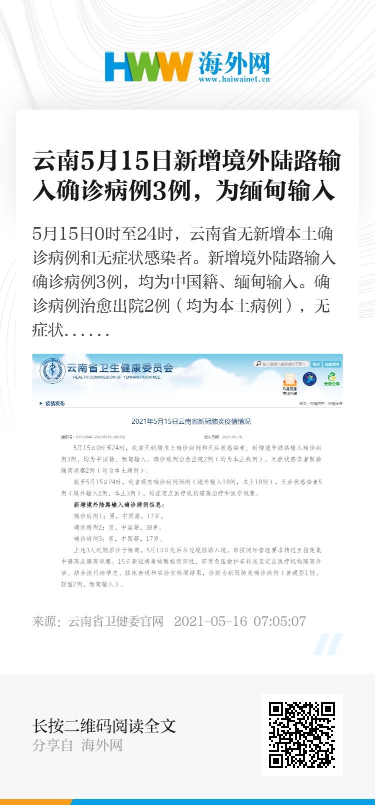 5月15日0时至24时,云南省无新增本土确诊病例和无症状感染者。新增境外陆路输入确诊病例3例,均为中国籍、缅甸输入。确诊病例治愈出院2例(均为本土病例),无症状感染者解除隔离观察2例(均为本土病例)。