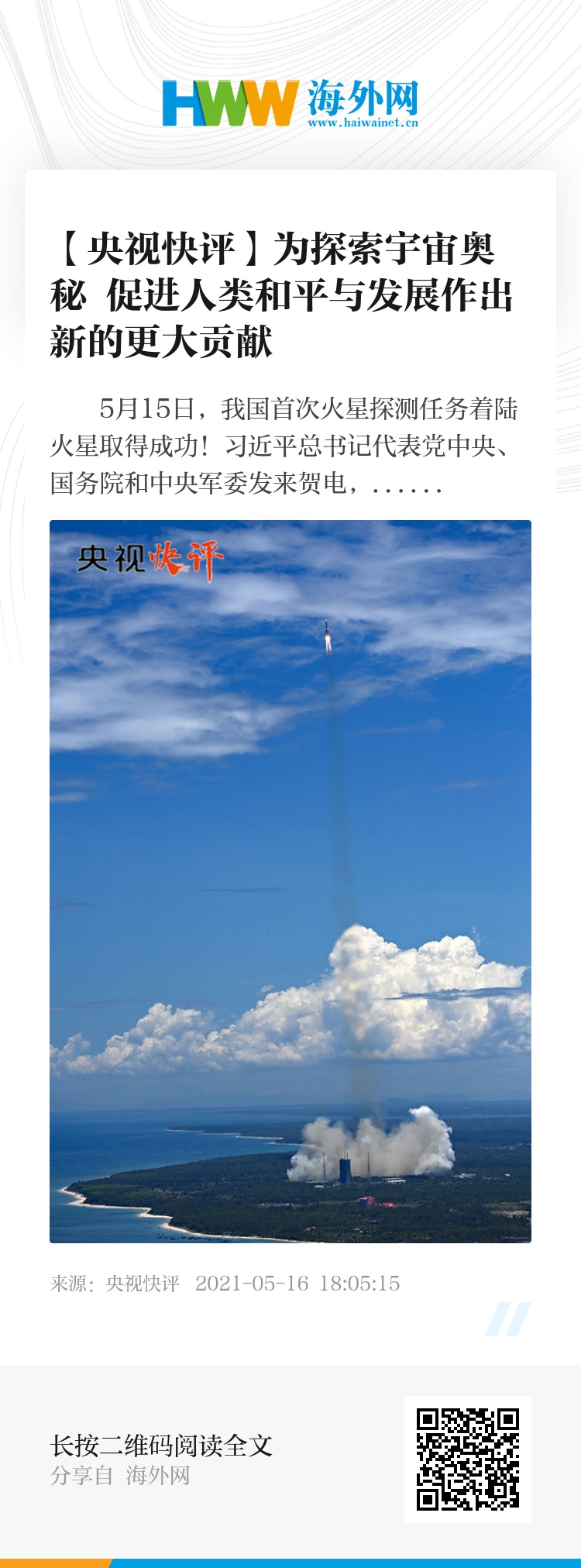 5月15日,我国首次火星探测任务着陆火星取得成功!习近平总书记代表党中央、国务院和中央军委发来贺电,希望中国航天人再接再厉,精心组织实施好火星巡视科学探测,坚持科技自立自强,精心推进行星探测等航天重大工程,加快建设航天强国,为探索宇宙奥秘、促进人类和平与发展的崇高事业作出新的更大贡献!