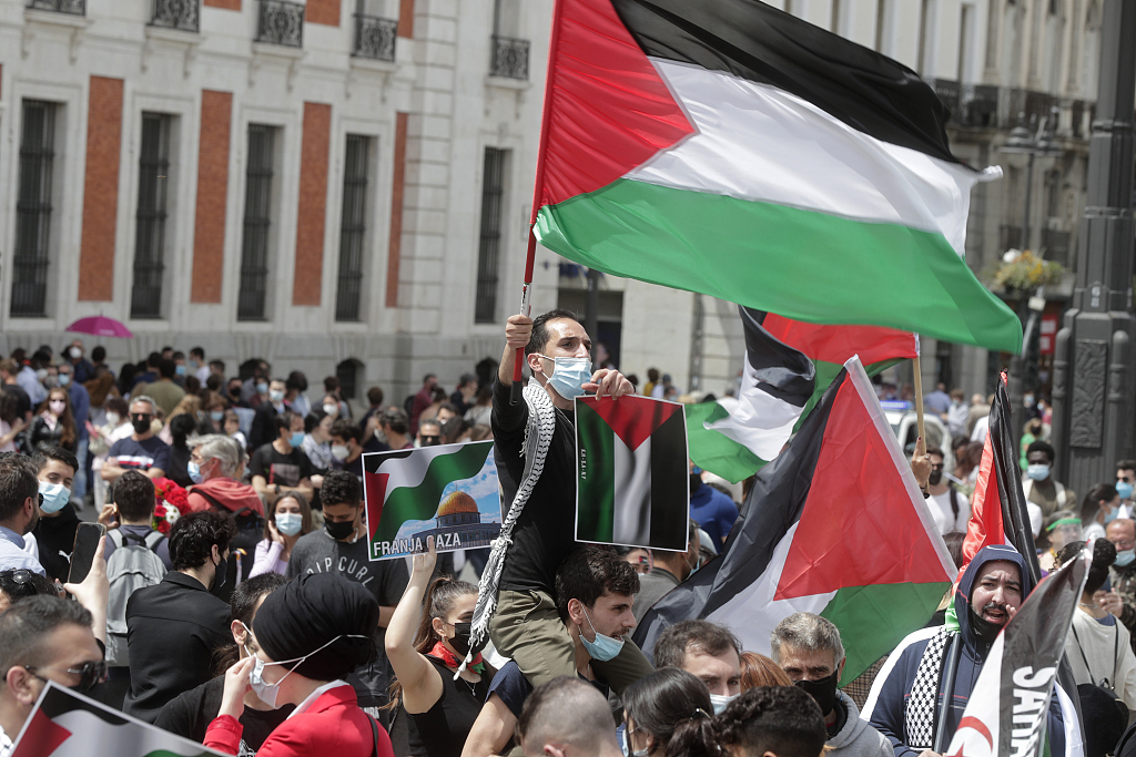 当地时间2021年5月15日,西班牙马德里,当地民众举行声援巴勒斯坦的游行示威活动。图片来源:人民视觉