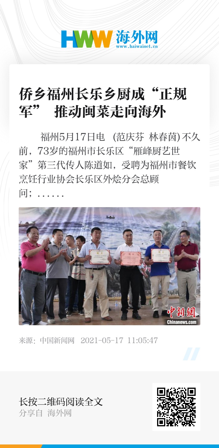 中新网福州5月17日电 (范庆芬 林春茵)不久前,73岁的福州市长乐区“雁峰厨艺世家”第三代传人陈道如,受聘为福州市餐饮烹饪行业协会长乐区外烩分会总顾问;陈传增、陈国官两位乡厨也受聘为福州市餐饮烹饪行业协会长乐区外烩分会顾问。与此同时,来自长乐十八个乡镇(街道)的乡厨们齐聚长乐区梅花镇,共话闽菜传承与发展。