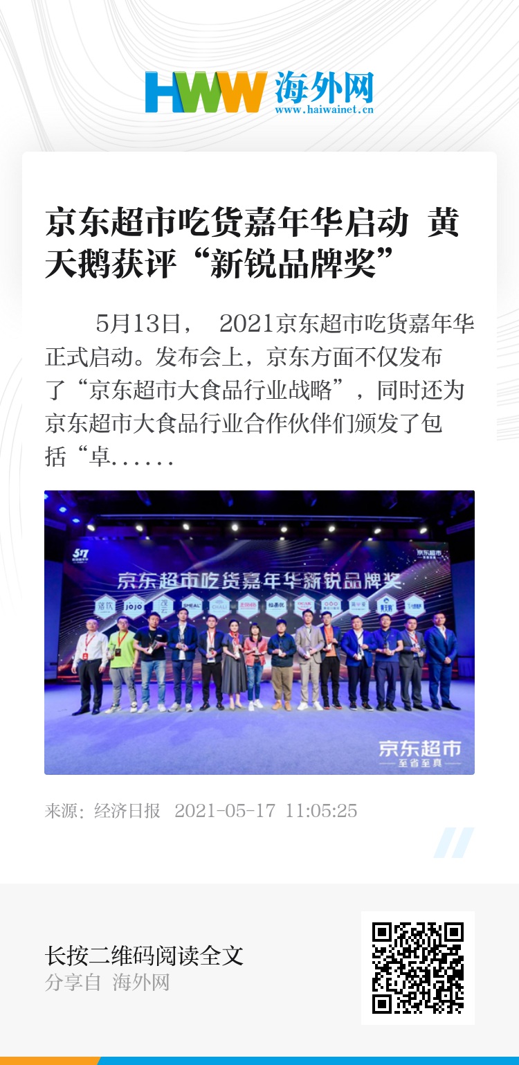 5月13日, 2021京东超市吃货嘉年华正式启动。发布会上,京东方面不仅发布了“京东超市大食品行业战略”,同时还为京东超市大食品行业合作伙伴们颁发了包括“卓越品牌奖”、“新锐品牌奖”在内的六大奖项。其中,国内高端蛋品行业领导品牌“黄天鹅”因其强大的品牌影响力以及在京东超市出色的销售业绩,获评“新锐品牌奖”。