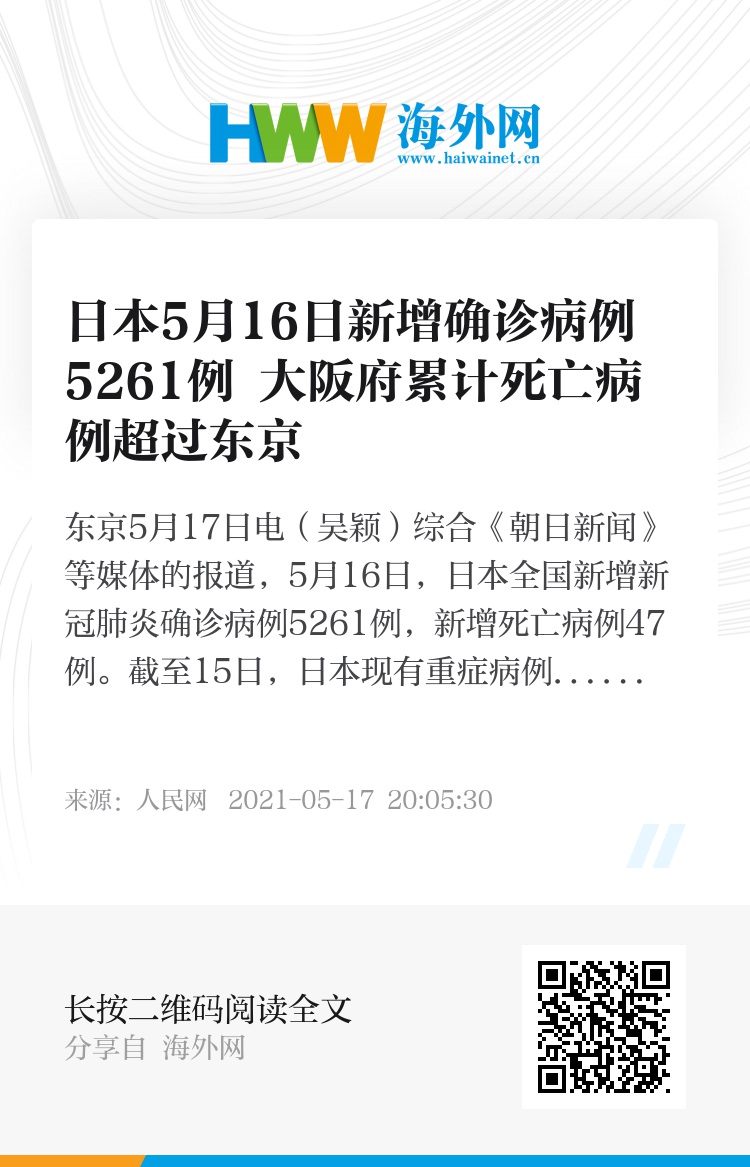 人民网东京5月17日电(吴颖)综合《朝日新闻》等媒体的报道,5月16日,日本全国新增新冠肺炎确诊病例5261例,新增死亡病例47例。截至15日,日本现有重症病例1223例,较前一日减少了8例。