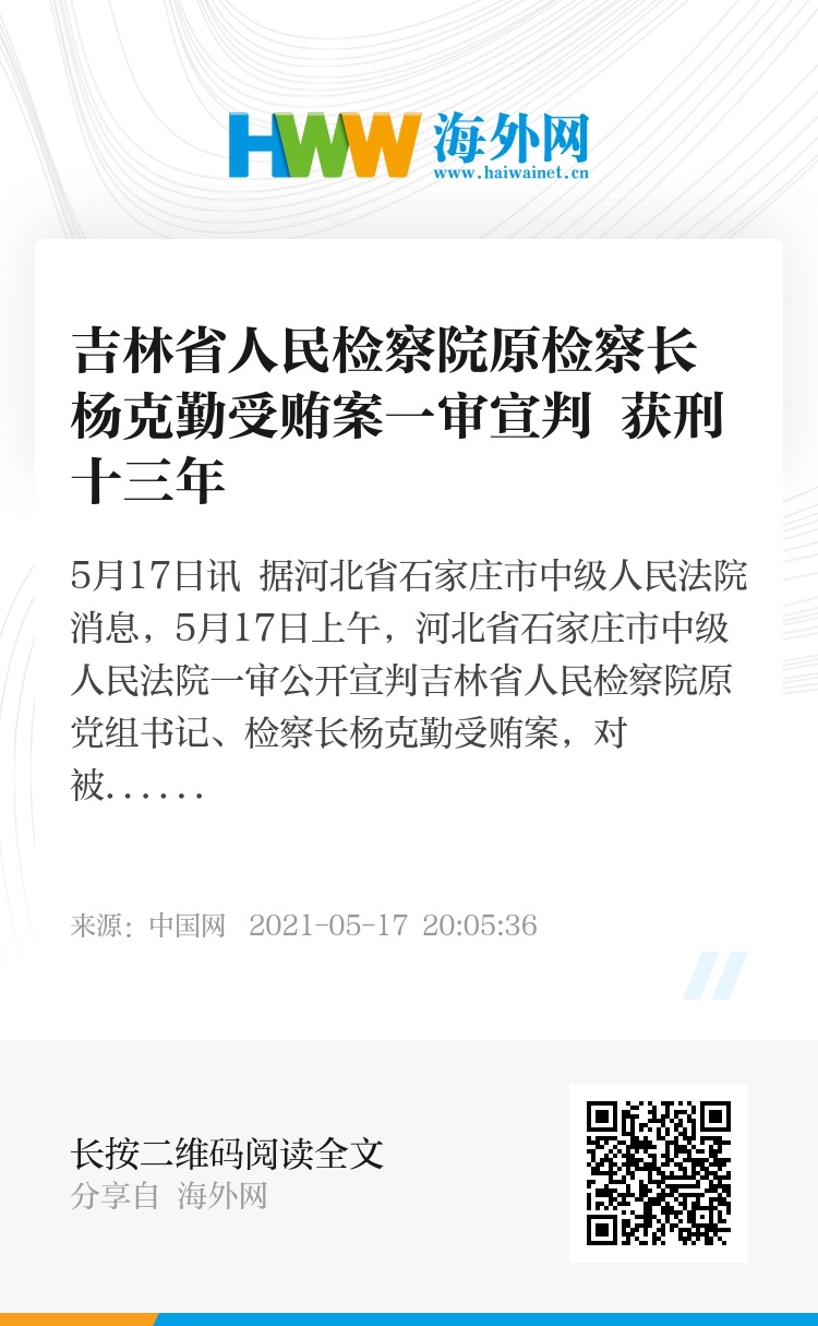中国网5月17日讯 据河北省石家庄市中级人民法院消息,5月17日上午,河北省石家庄市中级人民法院一审公开宣判吉林省人民检察院原党组书记、检察长杨克勤受贿案,对被告人杨克勤以受贿罪判处有期徒刑十三年,并处罚金人民币四百万元;对杨克勤受贿所得财物及其孳息依法予以追缴,上缴国库。