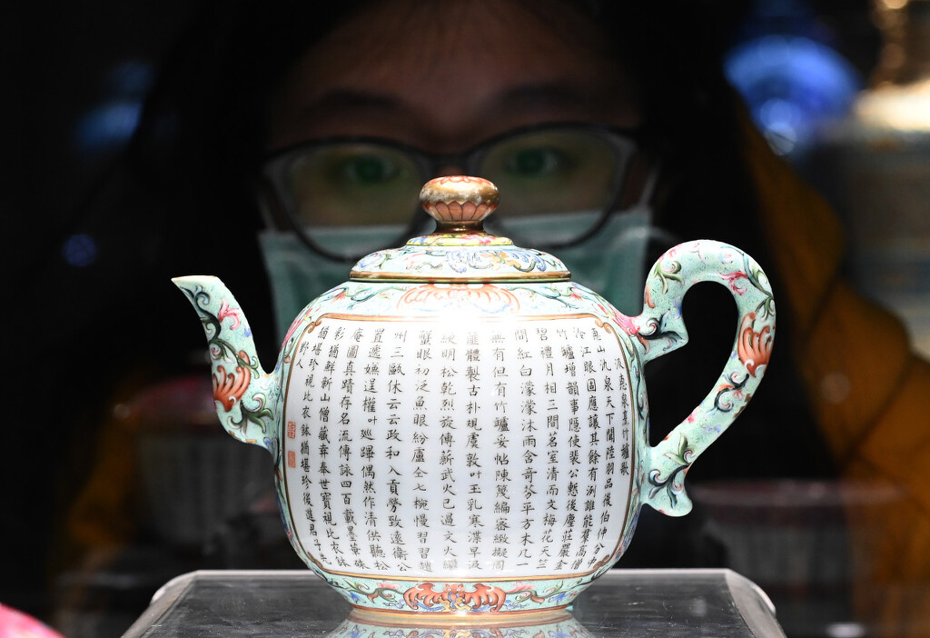 2021年4月27日,北京,位于保利艺术博物馆展示的“弘历的世界——乾隆御制诗文稿、兰亭图贴缂丝卷暨重要宫廷艺术特展”吸引观众前来参观。图为“洋彩轧道描金松石绿地开光御制诗‘惠山煮泉观卷图’茶壶”展品吸引参观者驻足观看。