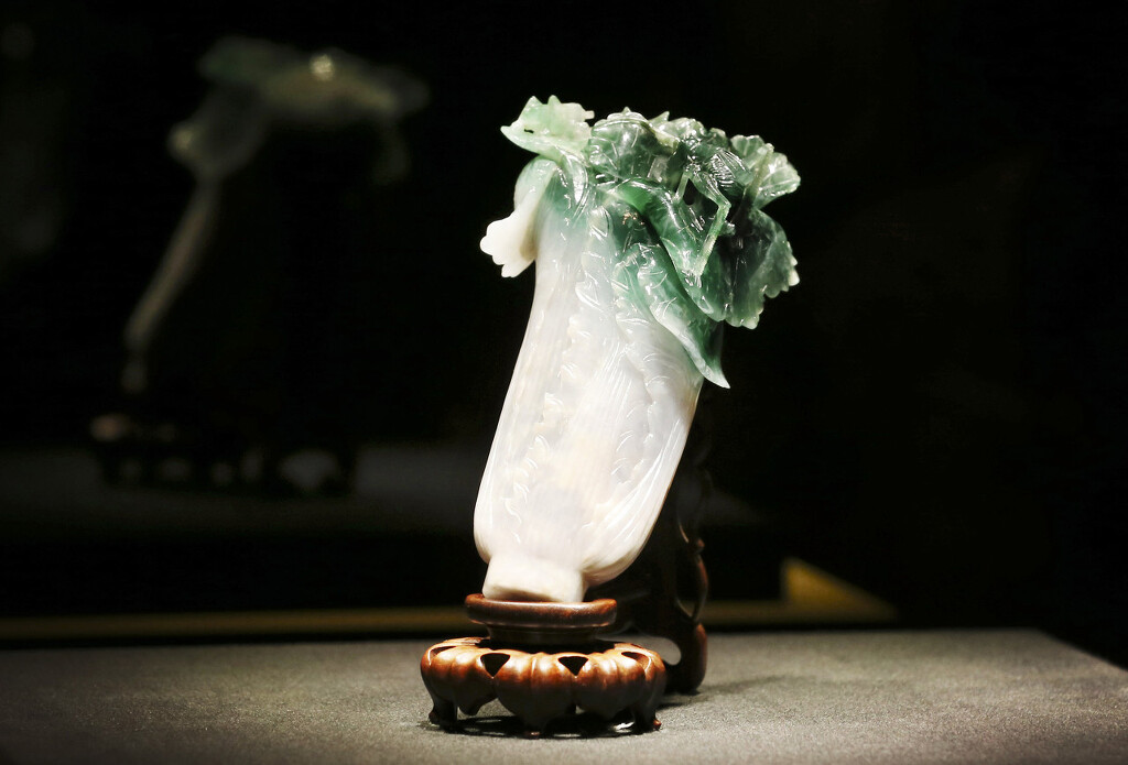 当地时间2014年6月23日,台北故宫博物院文物赴日本展览如期进行,东京博物馆上午举办内览会,吸引大批媒体记者等受邀人士大排长龙,鱼贯入场,在正式展出前已呈现争睹瑰宝风潮。 图为记者在开展前提前探营,一堵“翠玉白菜”的风采,通体高18.7公分,宽9.1公分,厚约5.07公分,晶莹可爱。