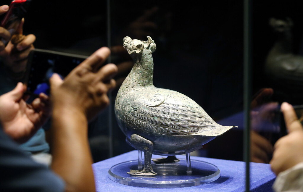2019年5月18日,云南昆明,国际博物馆日,云南省博物馆“国宝盛宴”再现《史记》中的西南边疆。在云南省博物馆举办的《国宝盛宴——<史记>中的西南边疆》展上,来自重庆中国三峡博物馆的战国“镶绿松石鸟型尊”。