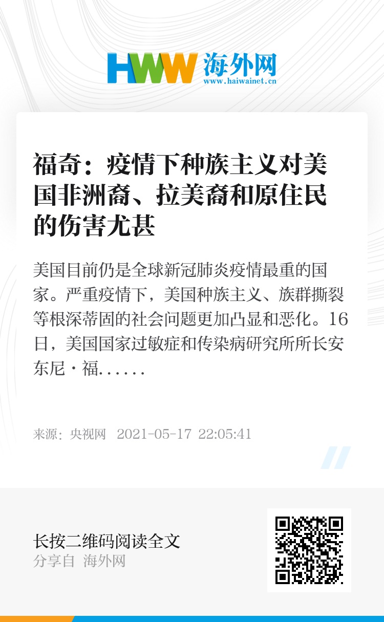 美国目前仍是全球新冠肺炎疫情最重的国家。严重疫情下,美国种族主义、族群撕裂等根深蒂固的社会问题更加凸显和恶化。16日,美国国家过敏症和传染病研究所所长安东尼·福奇表示,疫情暴露了美国“不可否认的种族主义影响”。