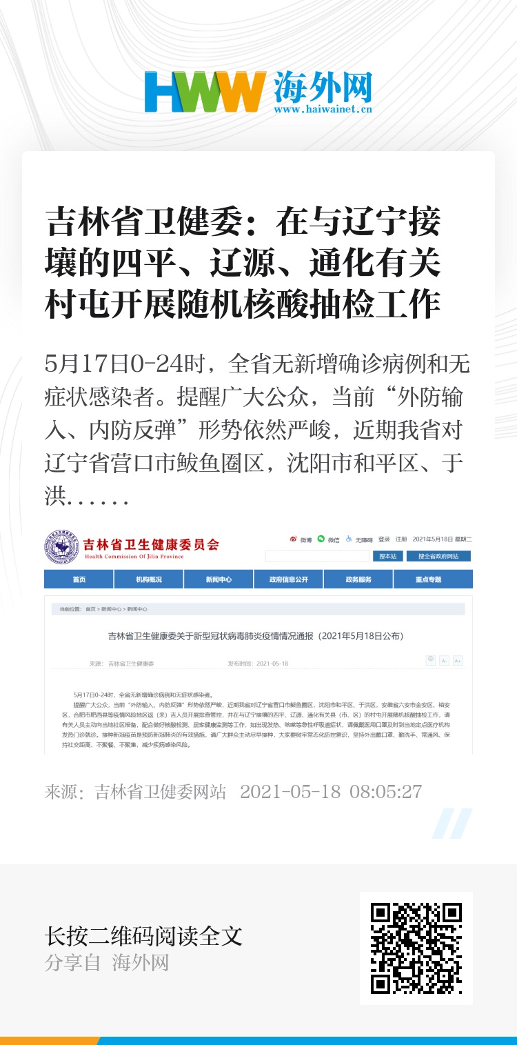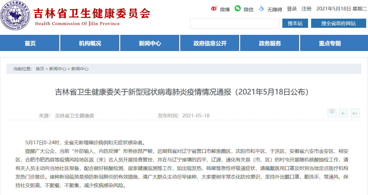 提醒广大公众,当前“外防输入、内防反弹”形势依然严峻,近期我省对辽宁省营口市鲅鱼圈区,沈阳市和平区、于洪区,安徽省六安市金安区、裕安区,合肥市肥西县等疫情风险地区返(来)吉人员开展排查管控,并在与辽宁接壤的四平、辽源、通化有关县(市、区)的村屯开展随机核酸抽检工作,请有关人员主动向当地社区报备,配合做好核酸检测、居家健康监测等工作,如出现发热、咳嗽等急性呼吸道症状,请佩戴医用口罩及时到当地定点医疗机构发热门诊就诊。接种新冠疫苗是预防新冠肺炎的有效措施,请广大群众主动尽早接种,大家要树牢常态化防控意识,坚持外出戴口罩、勤洗手、常通风、保持社交距离、不聚餐、不聚集,减少疾病感染风险。