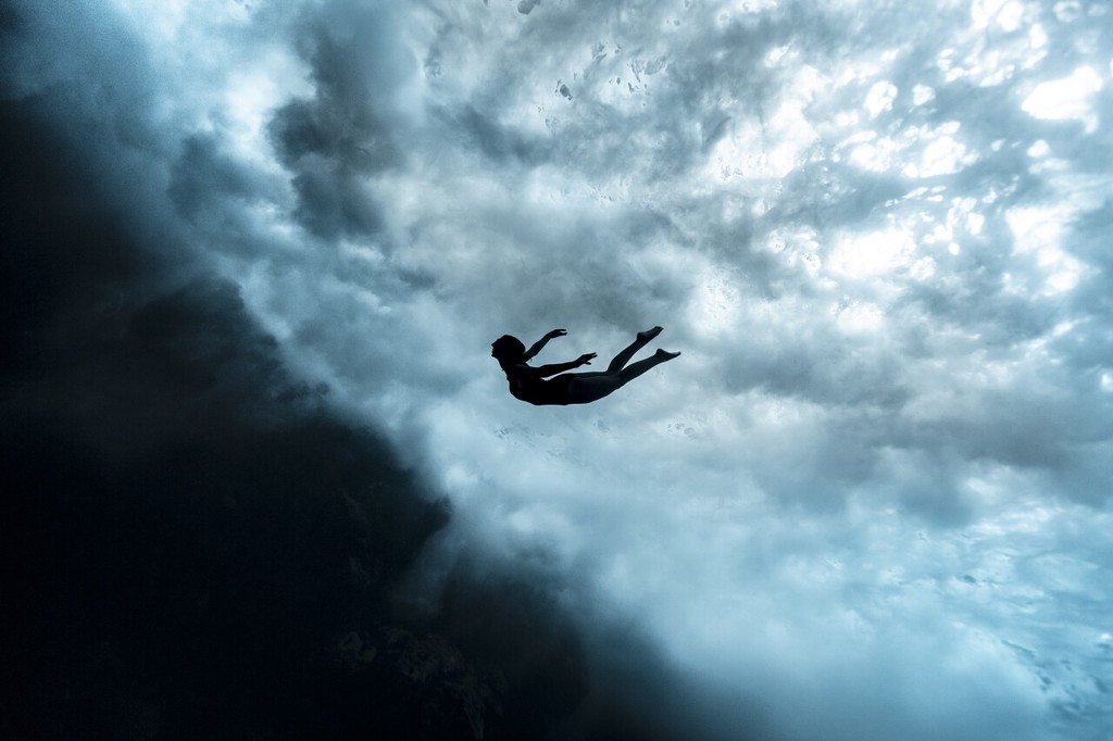 2021年5月报道(具体拍摄时间不详),42岁的Marianne Aventurier在大溪地塔拉瓦奥海中自由潜水,丈夫Alex Voyer为她拍摄了一系列自由潜水大片,不过这些照片却让人产生了错觉,画面中Marianne Aventurier不像是潜水游泳,看起来像是在空中飞翔和跳伞,波涛汹涌的海浪宛如云朵一般。图片来源: catersnews/IC photo