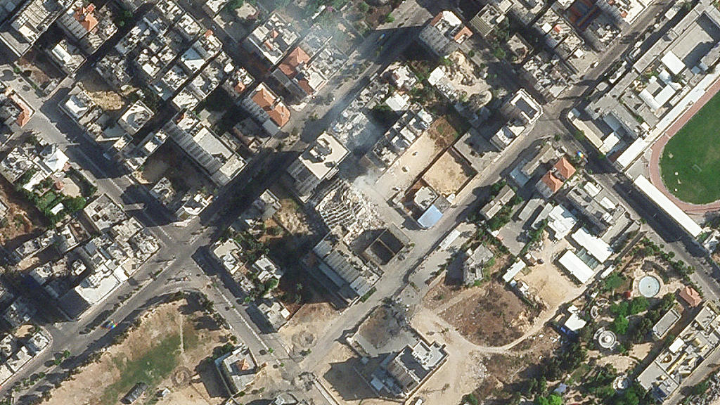 当地时间5月16日,加沙地区,卫星图像记录下遭受空袭的大楼建筑。图片来源:人民视觉