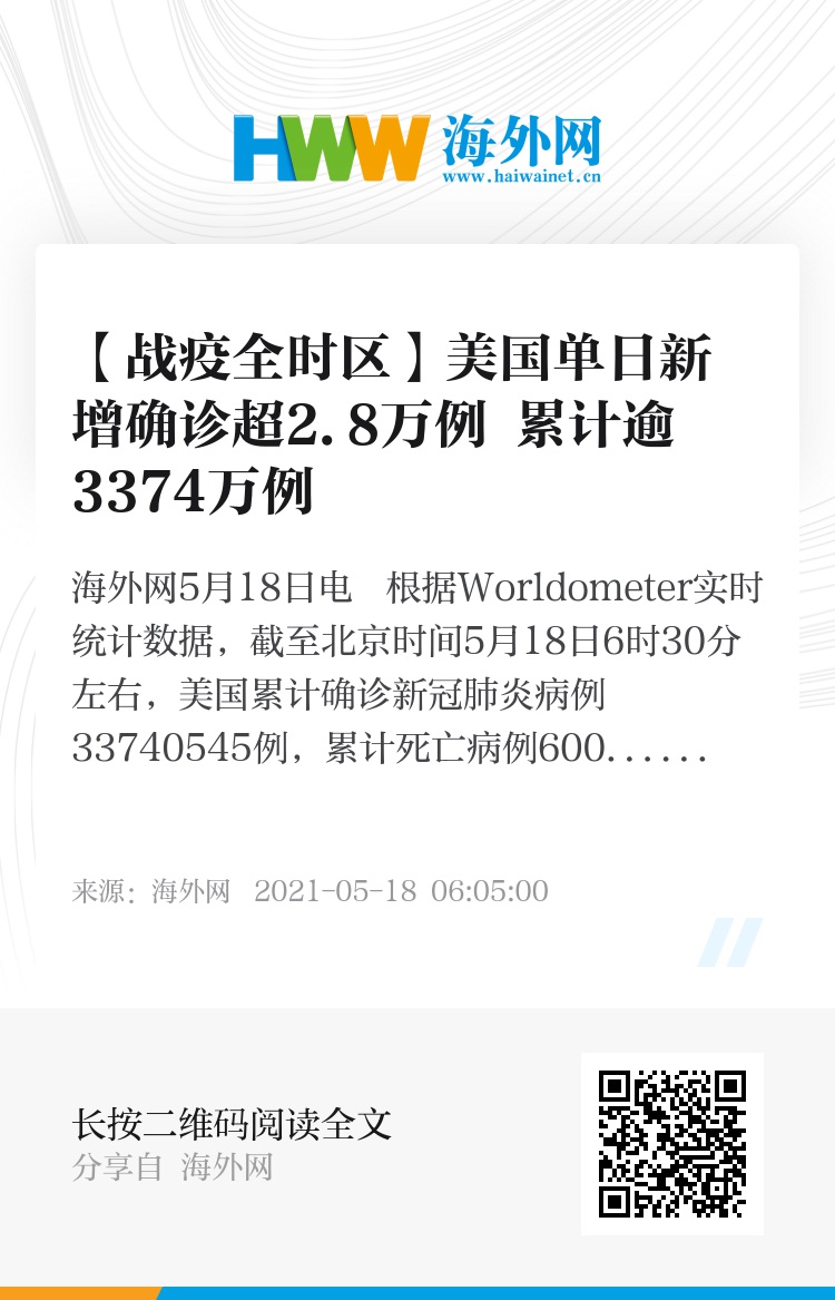海外网5月18日电 根据Worldometer实时统计数据,截至北京时间5月18日6时30分左右,美国累计确诊新冠肺炎病例33740545例,累计死亡病例600478例。与前一日6时30分数据相比,美国新增确诊病例28403例,新增死亡病例339例。(海外网 张敏)