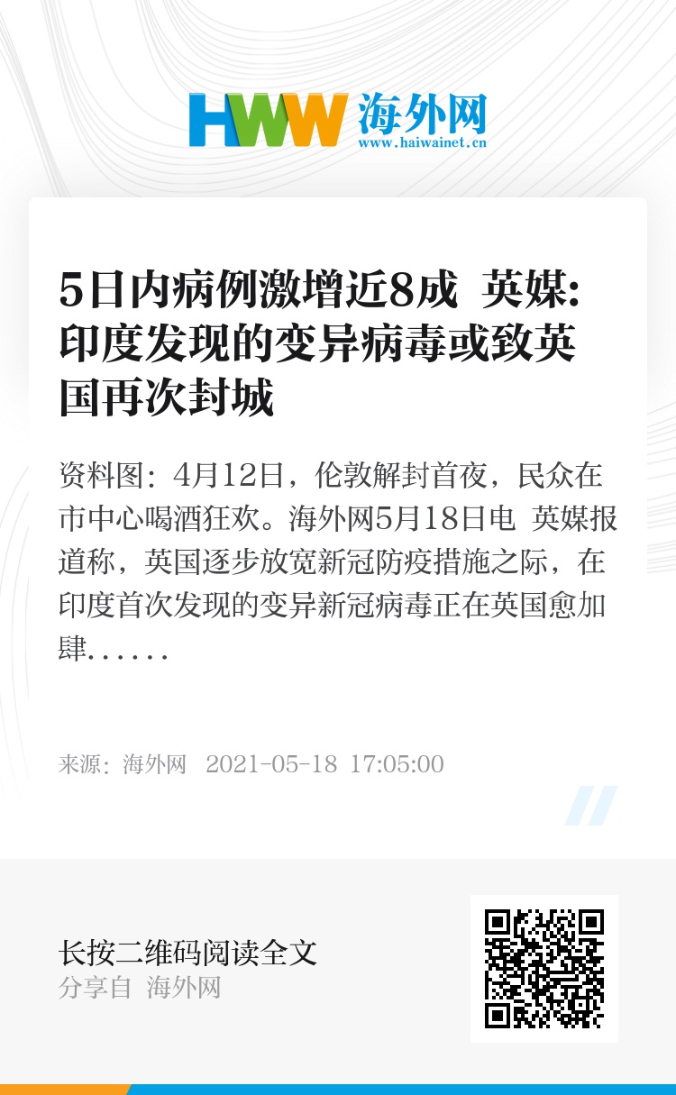 英国首相府也表示,印度发现的变异病毒可威胁政府是否继续于6月21日解除所有防疫限制。发言人指出政府需观察更多数据才作决定,“一旦数据允许,我们将制定计划”。当被问及内阁是否会考虑恢复规则的等级制时,发言人说,他们不想谈论假设的情况,但“我们不想排除任何情况”。